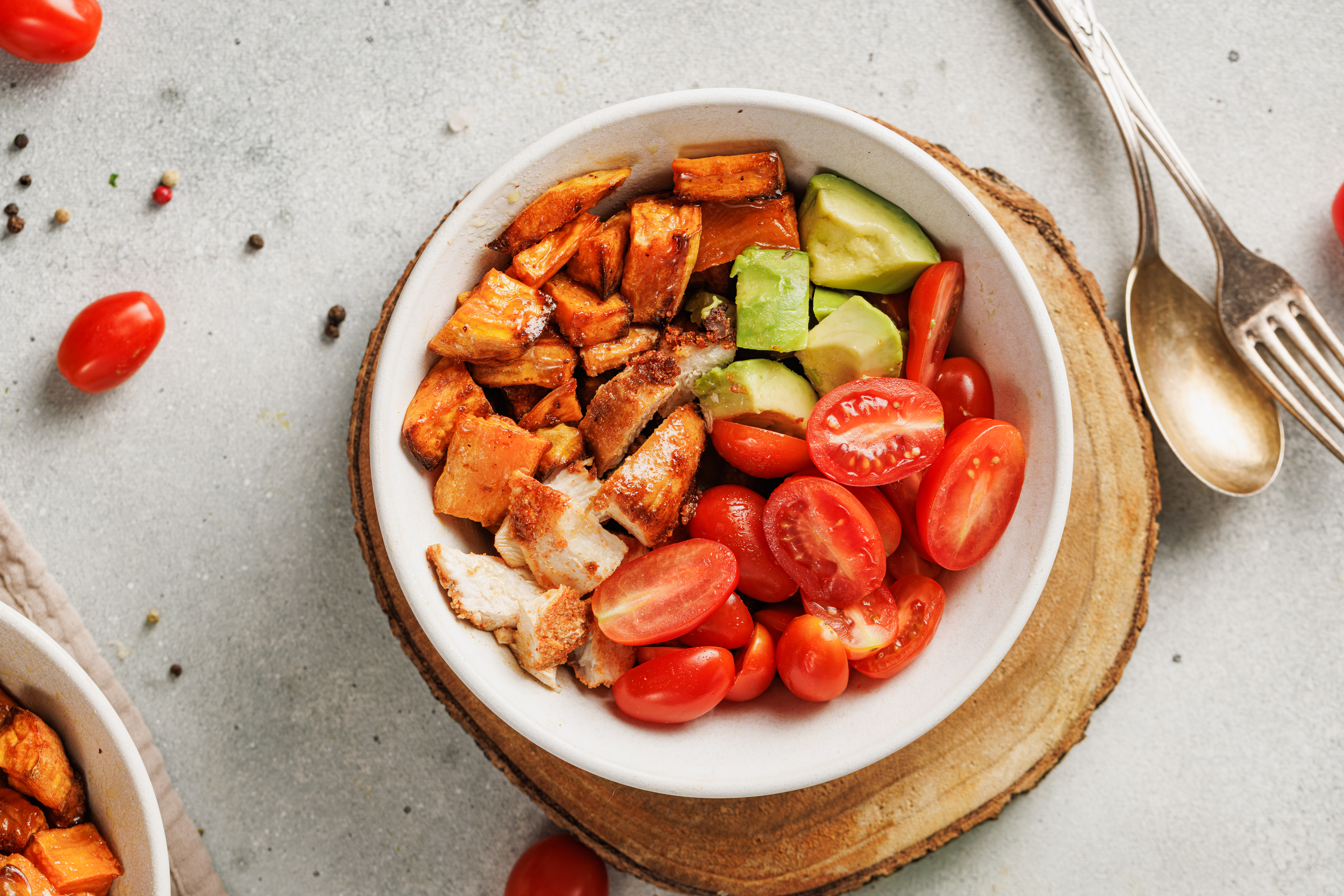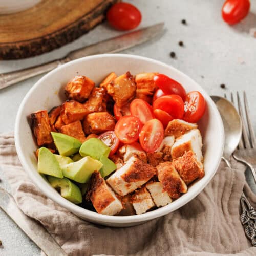 - Build bowls with roasted sweet potatoes, cherry tomatoes, avocado, and sliced chicken.
