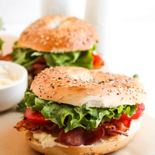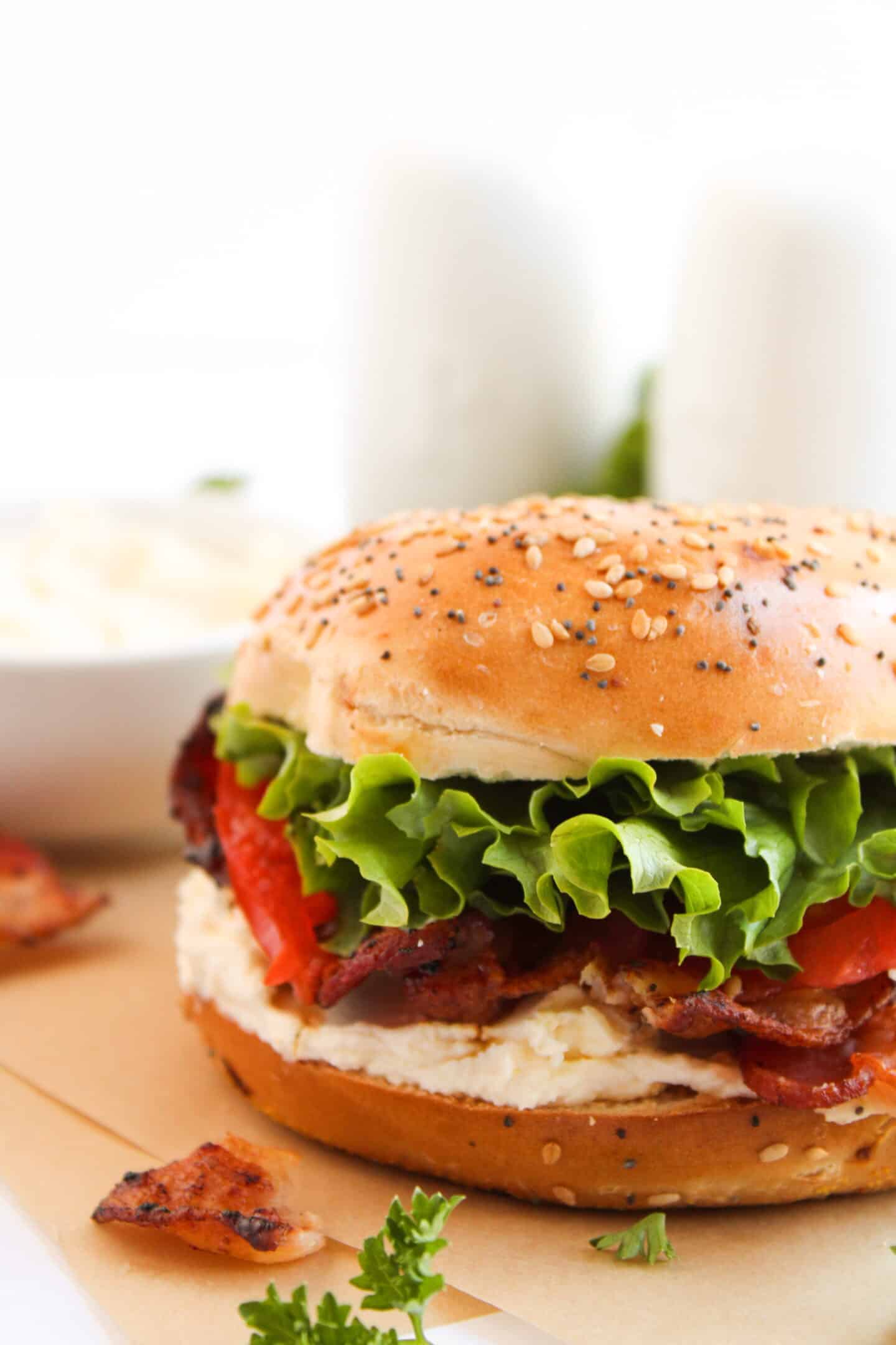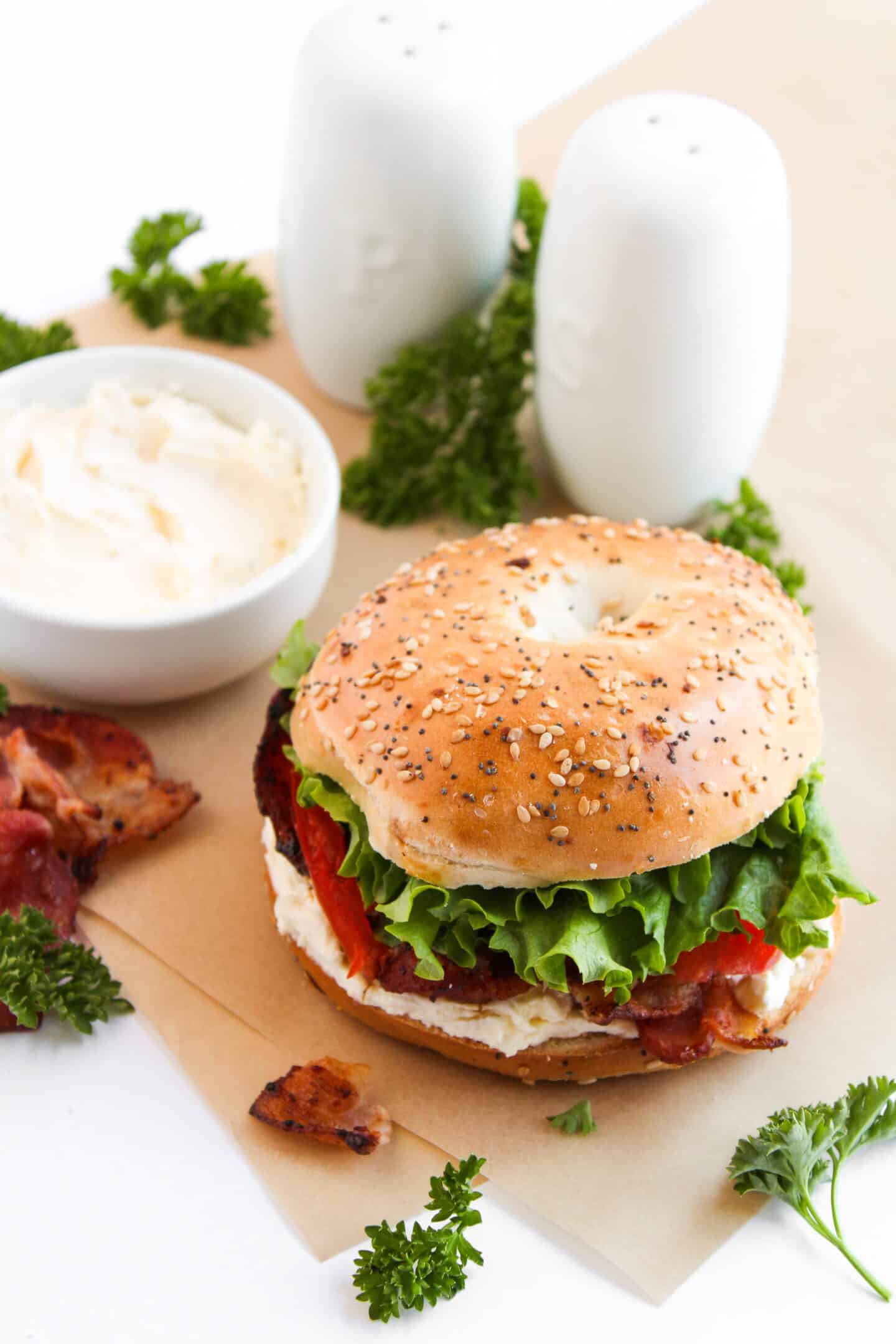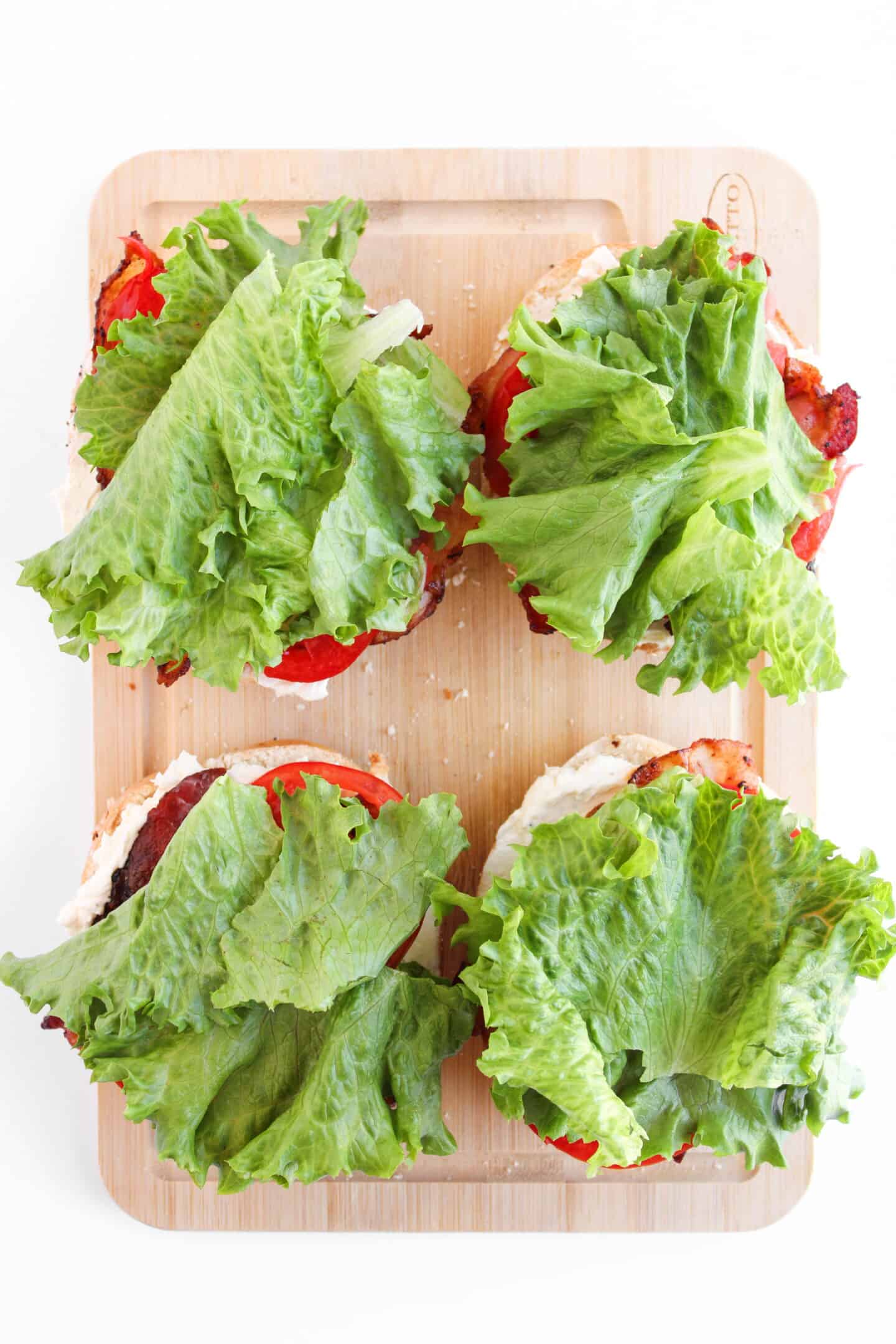 - Spread the mayo cream cheese mixture evenly over the bottom halves of the bagels, then layer with bacon, lettuce, and tomato. Top with the remaining bagel halves.