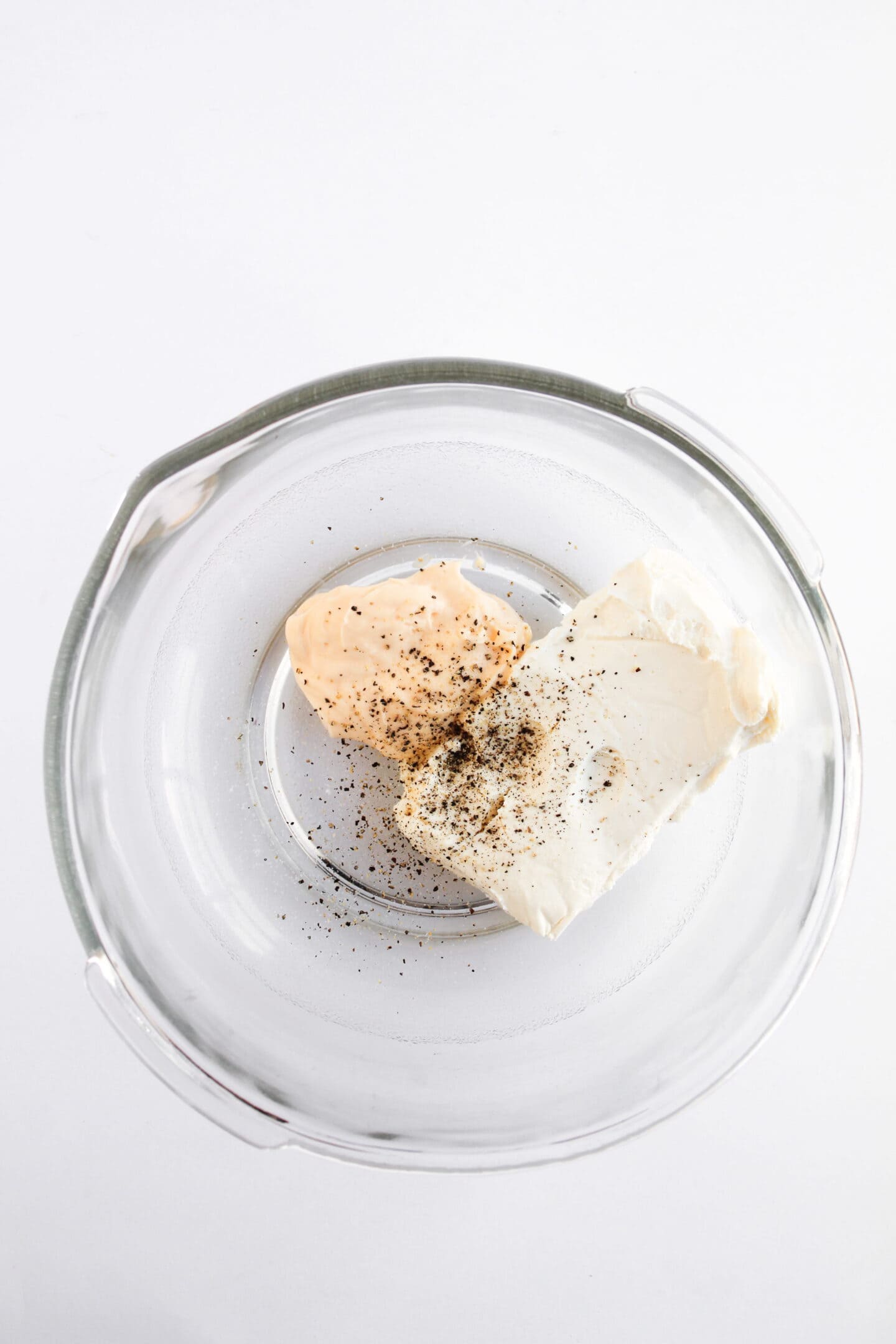 - In a large bowl, use a hand mixer or stand mixer to beat together the cream cheese, mayonnaise, salt, and pepper until smooth and creamy.