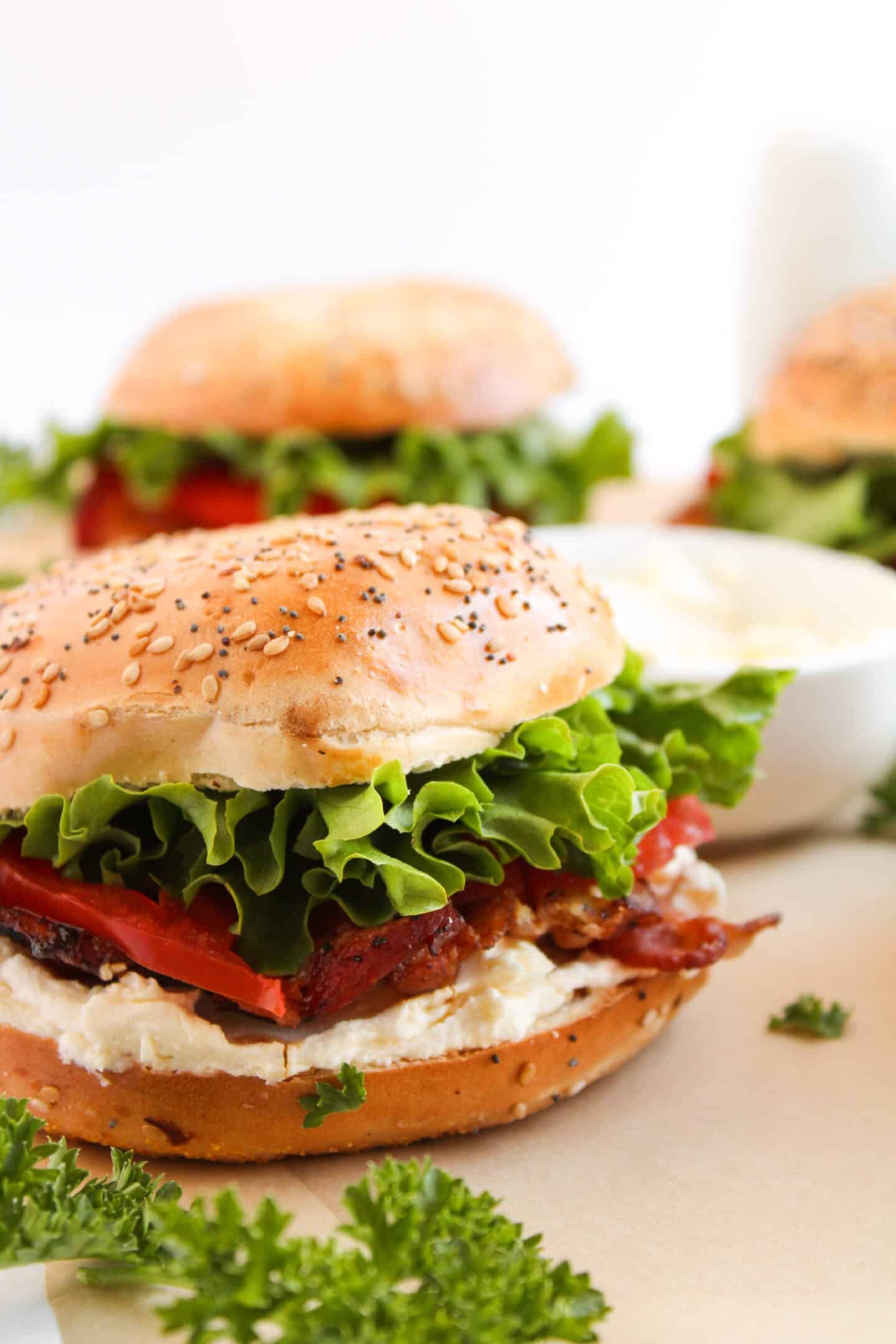 Step 4: Spread the mayo cream cheese mixture evenly over the bottom halves of the bagels, then layer with bacon, lettuce, and tomato. Top with the remaining bagel halves.