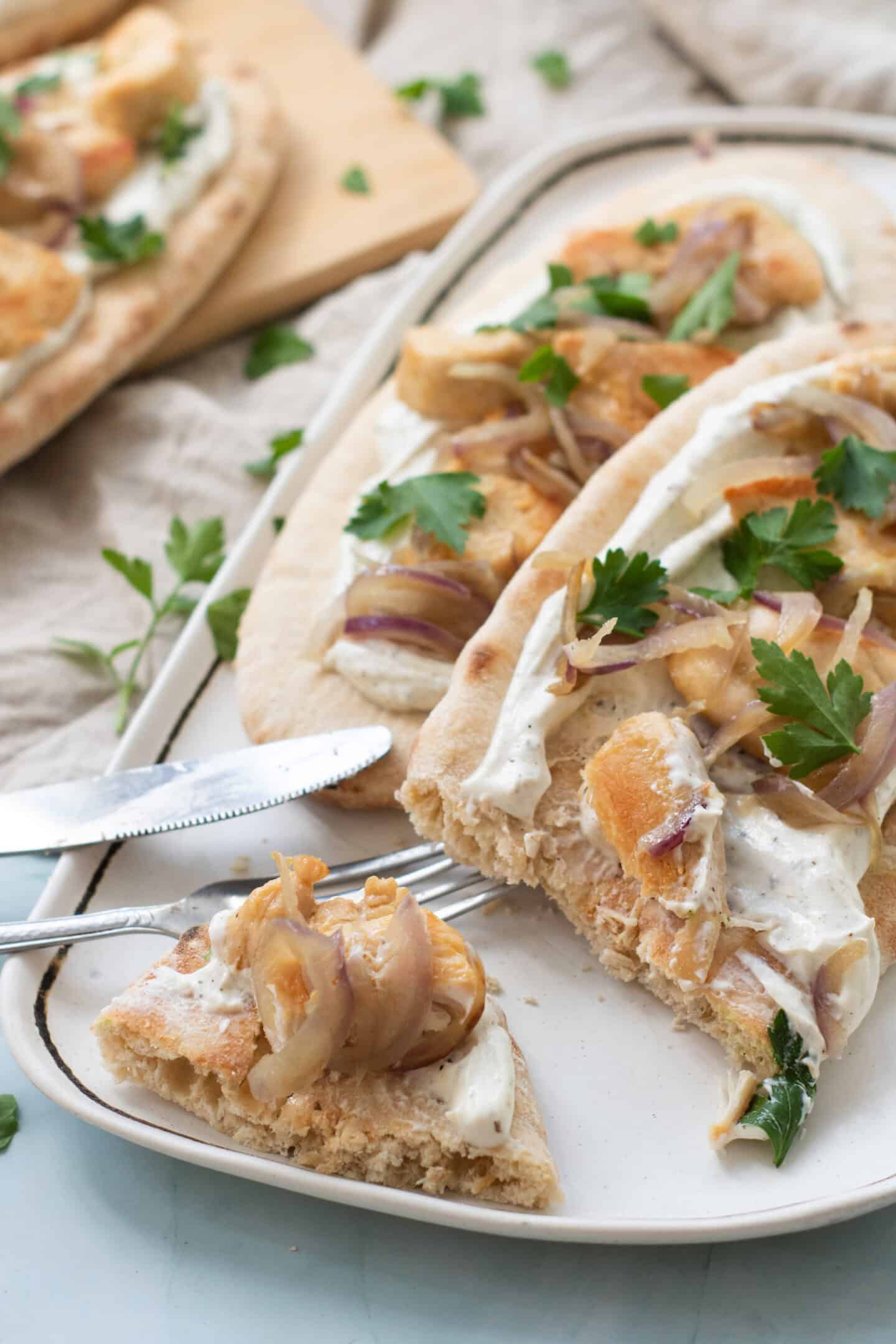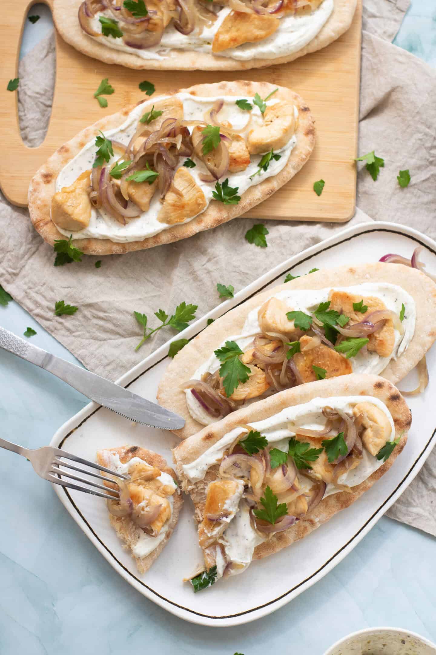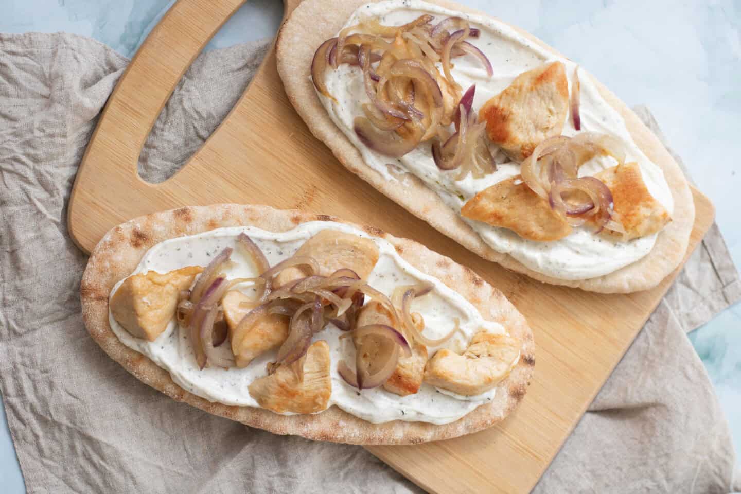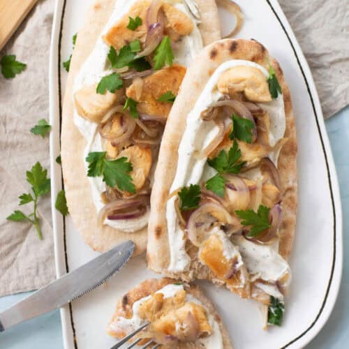 - Spread a generous amount of the prepared yogurt sauce on each warm pita bread. Top with the cooked chicken and sautéed onions.