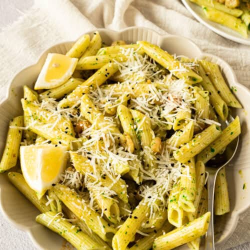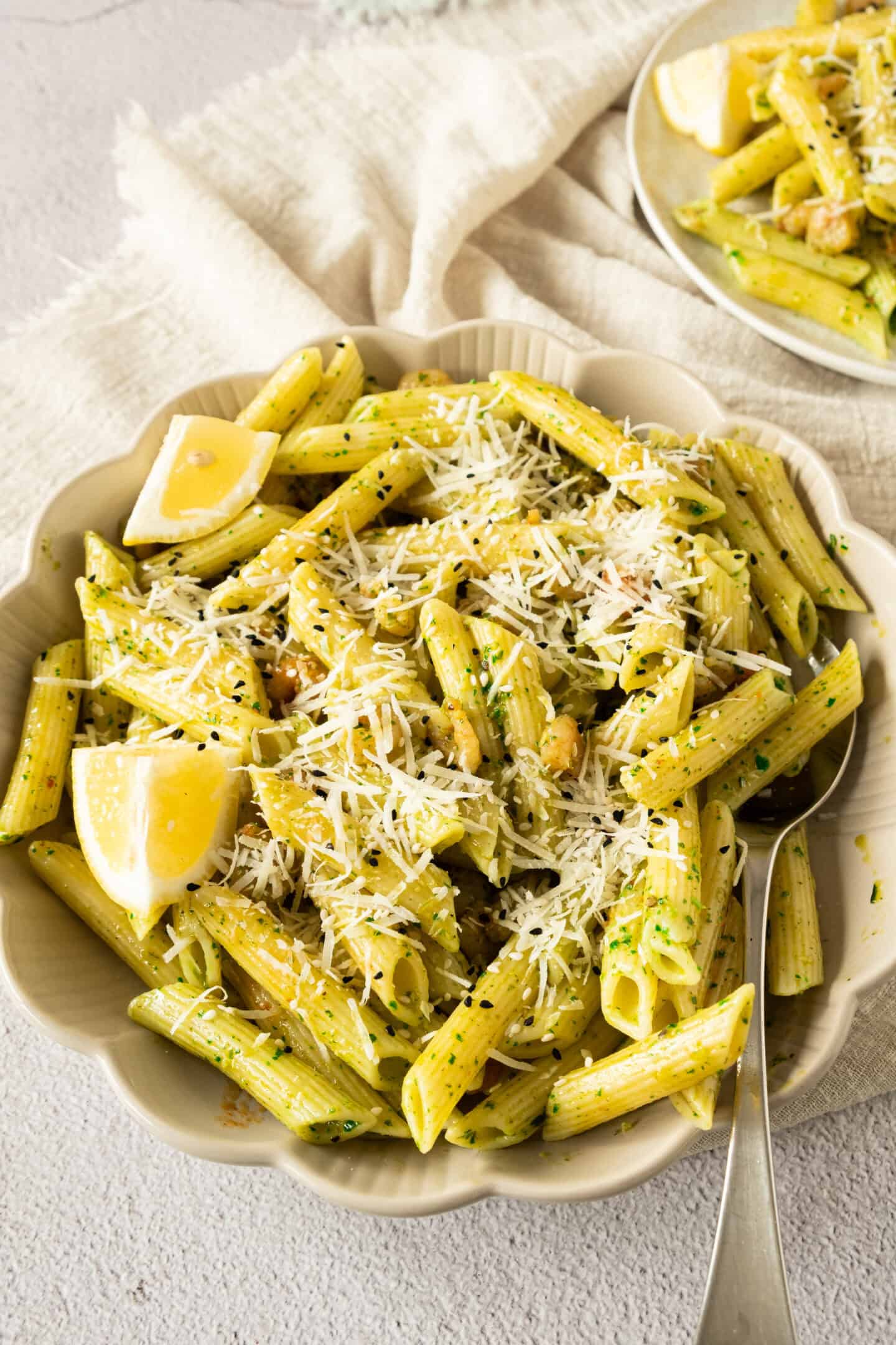 - Serve immediately on plates, garnishing with the Parmesan cheese, sesame seeds, and a final squeeze of fresh lemon juice.