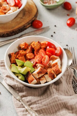 Looking for more chicken recipes? Try this blackened chicken and sweet potato bowl or sheet pan bbq chicken thighs next.