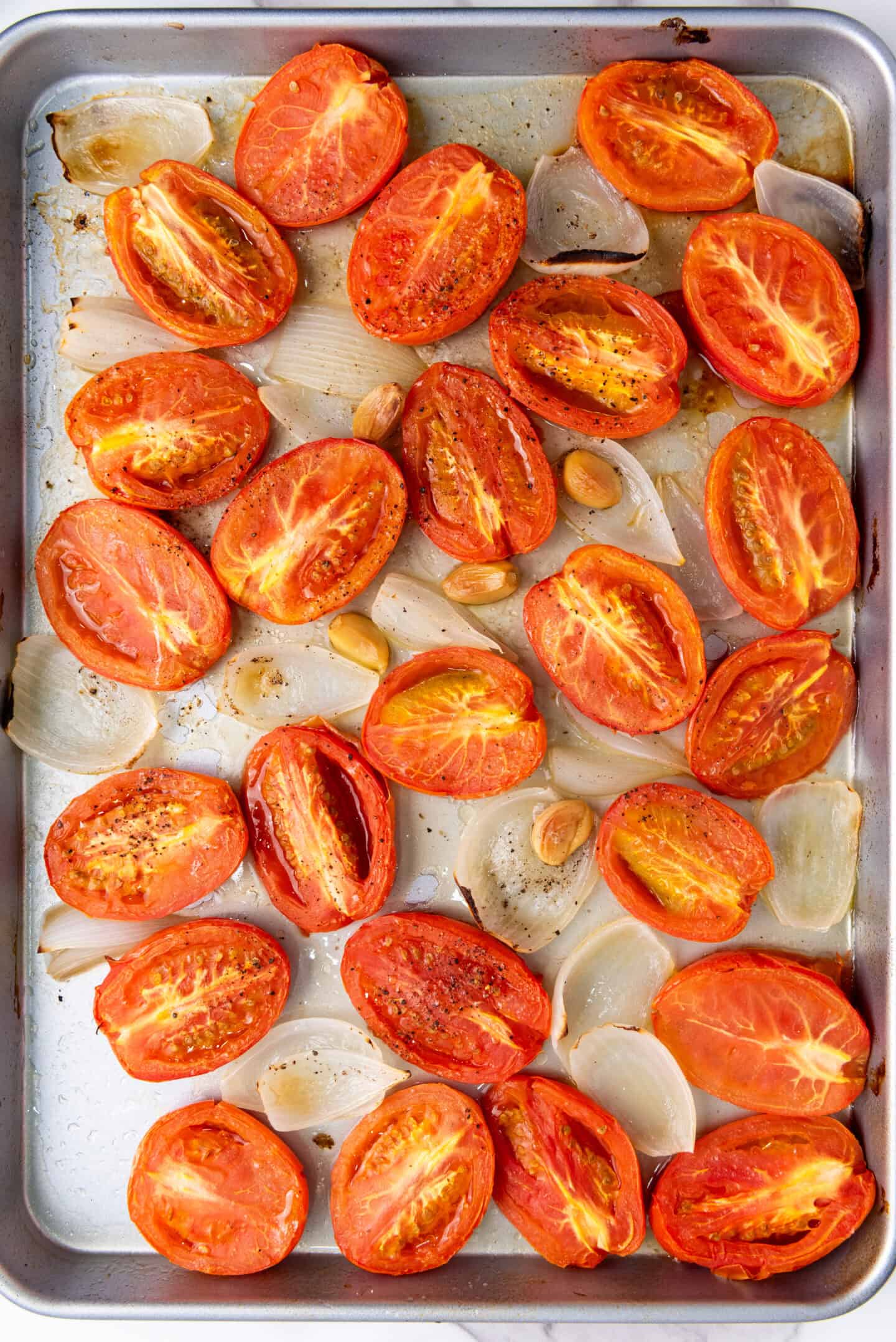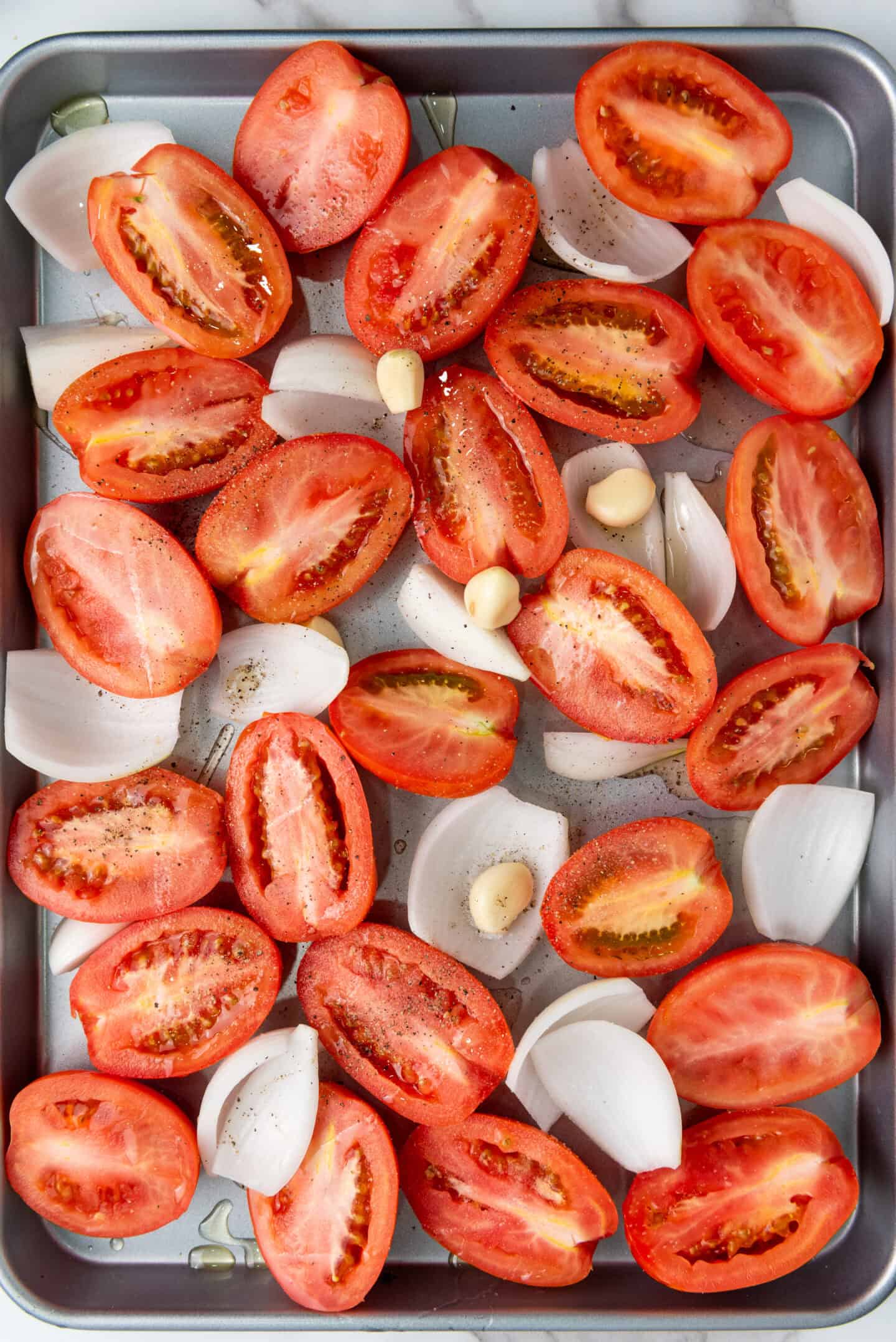 Step 1: Arrange the tomatoes, onions, and garlic on a baking sheet and drizzle olive oil over the vegetables, season with salt and pepper, then mix everything together until well combine