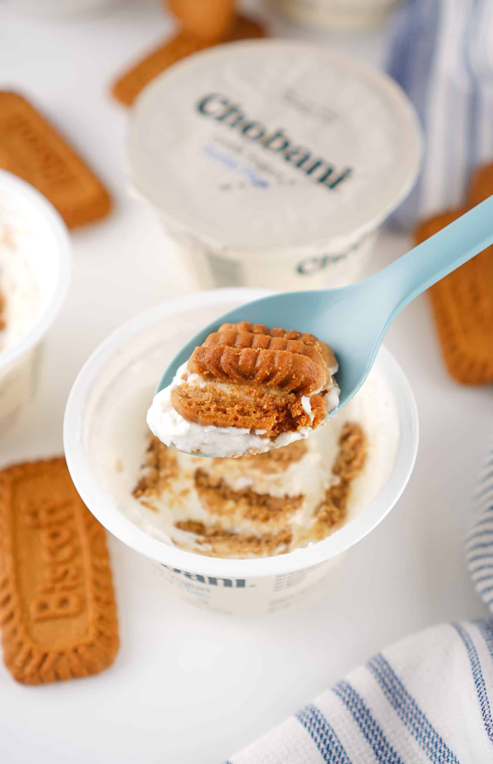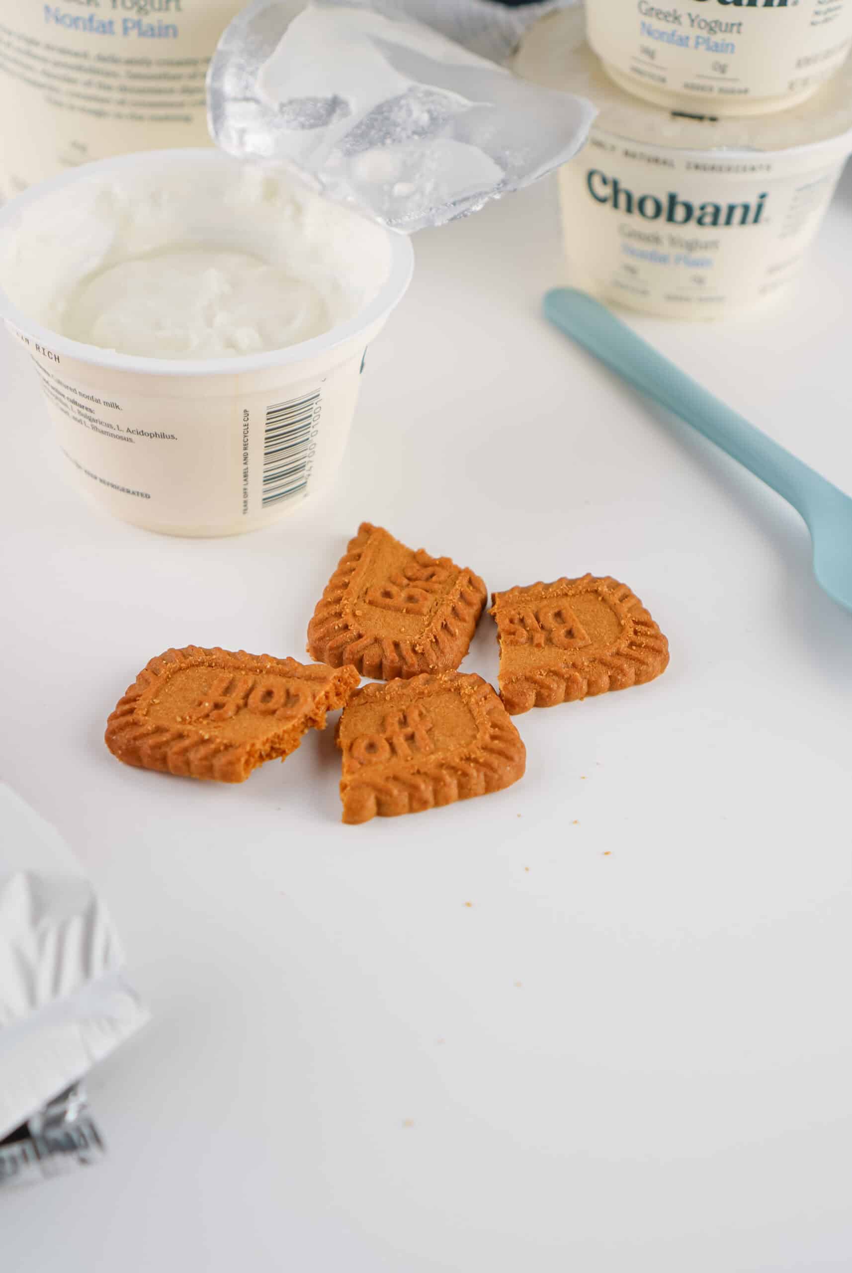 - Break 3 Biscoff cookies in half. Press the jagged edge of each half into the yogurt until only the tip of the cookie is popping out.
