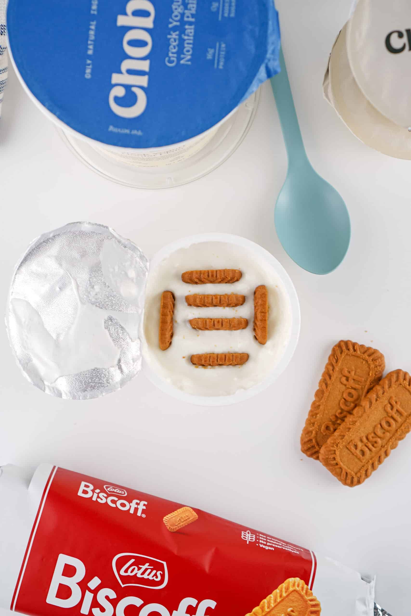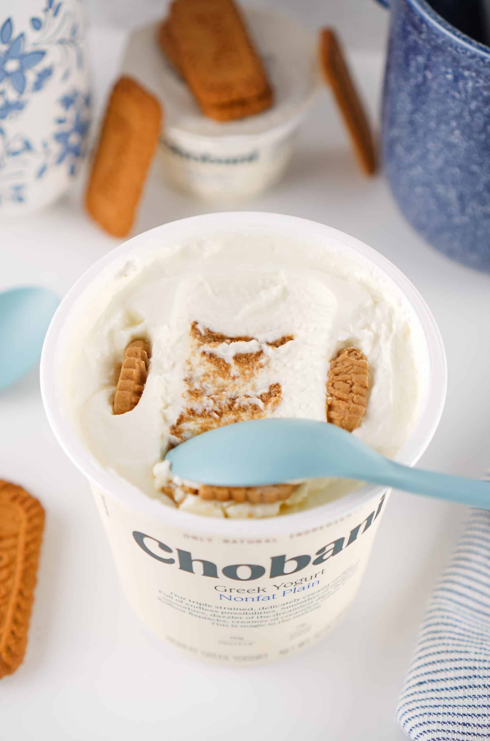 - Press 6 Biscoff cookies in a row directly into the yogurt. Push them down until only the very top is visible. Focus on filling the major empty spaces, as perfection is not necessary.